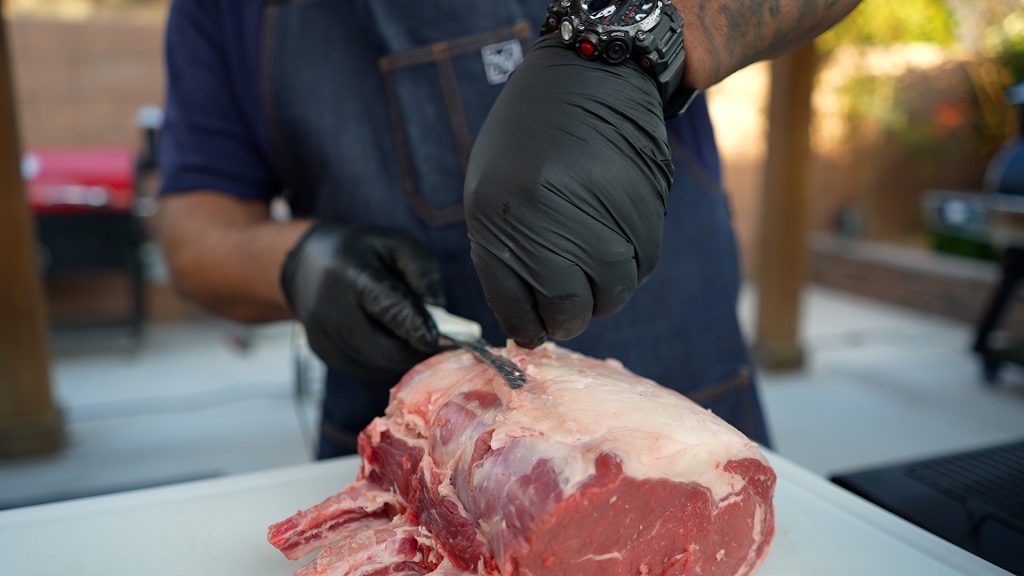 • Trim excess fat from the prime rib using a sharp knife. Optionally, tie the roast using butcher twine for even cooking.