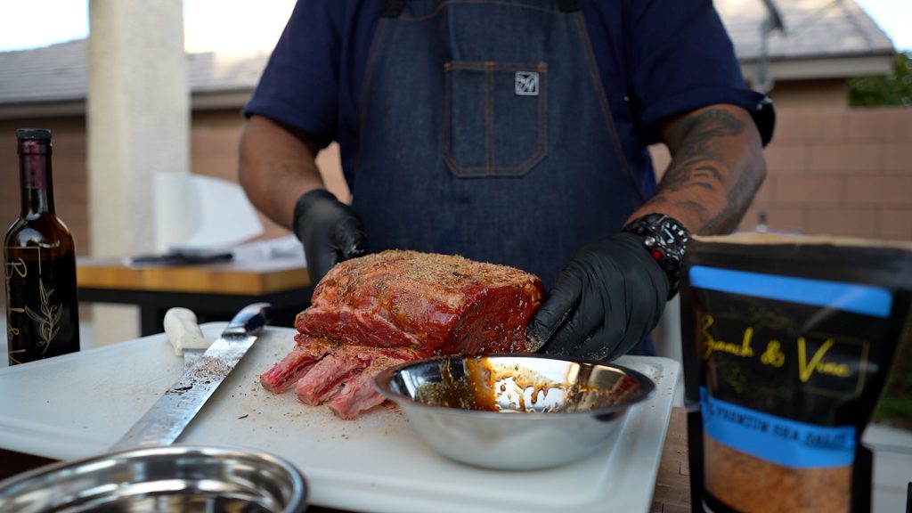 • Brush the prime rib with Branch and Vine Garlic Infused Olive Oil and Branch and Vine Hickory Balsamic Vinegar as a binder. Generously rub the seasoning mixture over the prime rib, ensuring it’s well coated.