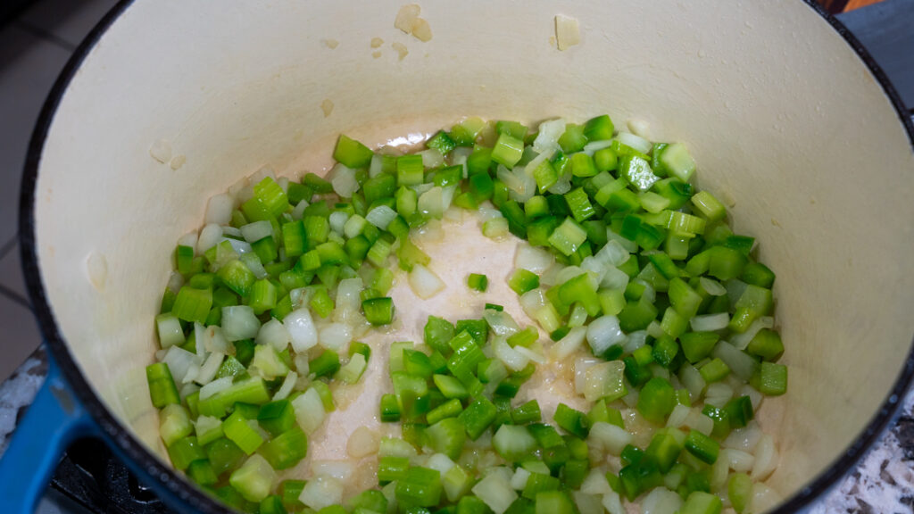 • In a 5-quart Dutch oven, heat 1 tablespoon olive oil over medium heat. Add onion, celery, and green pepper. Sauté until softened, then add garlic and cook for another minute.