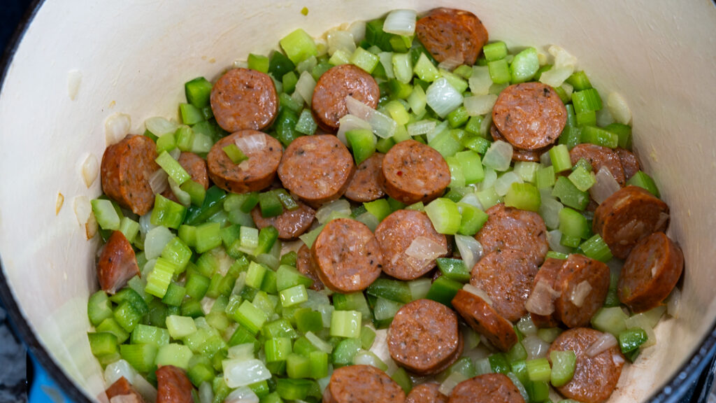 Stir in the sliced andouille sausage and cook until lightly browned, letting the fat render and flavor the base of the dish.