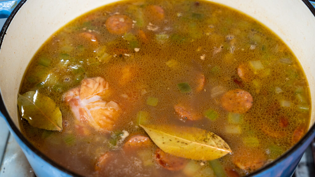 Add the soaked beans and their soaking liquid to the pot, followed by the smoked turkey leg or wing, bay leaf, cayenne, and cumin. Pour in two cups of homemade chicken stock, then add enough water to cover the beans by about an inch.