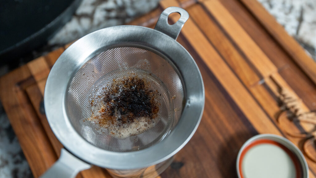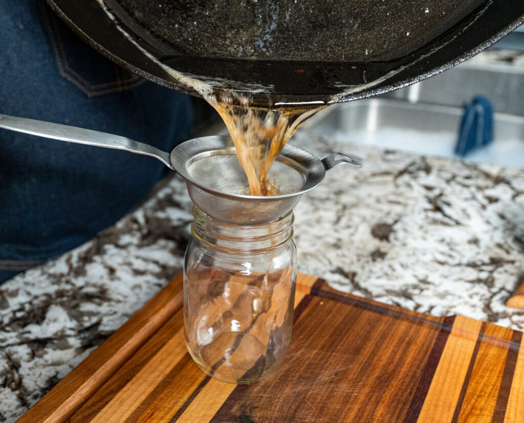 - Place a fine mesh strainer or cheesecloth over your jar, and carefully pour the grease through to remove any bits or crumbs.