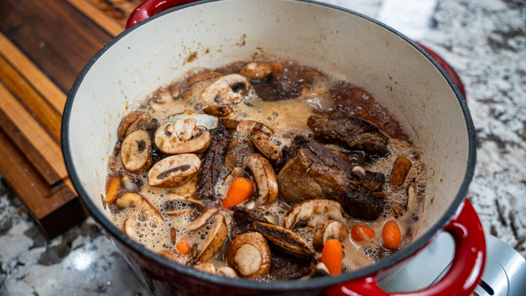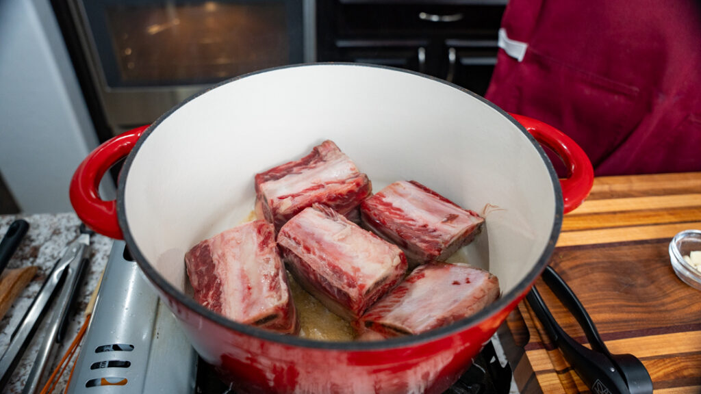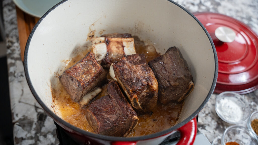 Crank up the heat and sear the short ribs on all sides until beautifully browned. Take your time — this step builds the base of your sauce.