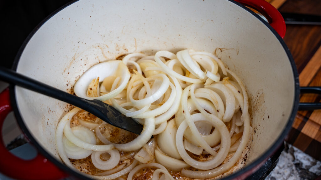 - Lower heat to medium. Add diced onions and minced garlic to the pot and cook for 3–5 minutes, or until softened and fragrant.