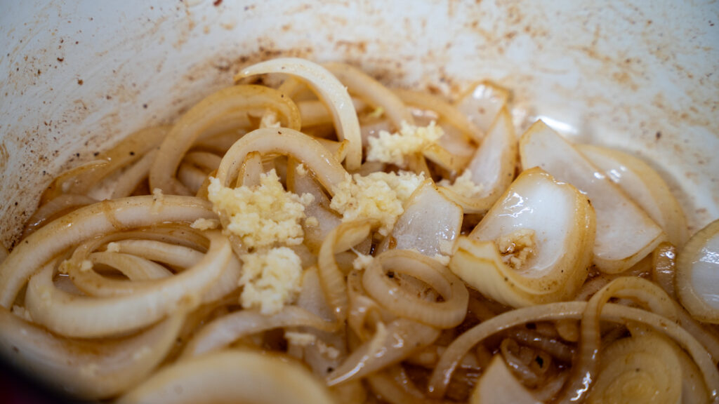 Lower the heat a bit, then add diced onions and minced garlic. Let them soften and pick up all that caramelized goodness from the bottom of the pot.