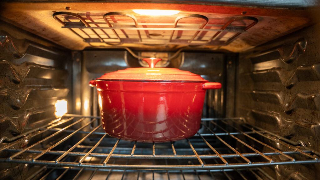 - Return the short ribs to the pot, making sure they’re nestled in the liquid. Cover and transfer to a preheated oven at 340°F (170°C).