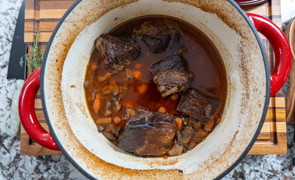 Nestle the short ribs back into the pot. Cover and braise in the oven at 340°F until the meat is tender and nearly falling off the bone — about 2½ hours.