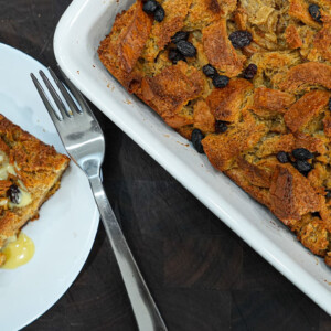 - Spoon the bread mixture into the prepared baking dish, ensuring even distribution of raisins.