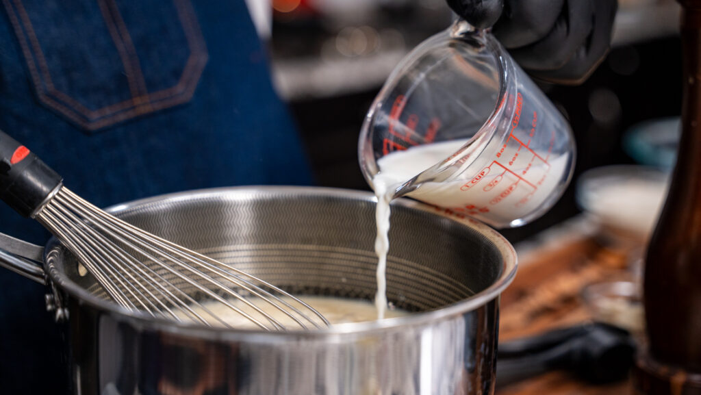 - Heat the chicken broth and milk in a medium pot until simmering.