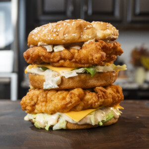 You might know the classic Big Mac, but we’re giving it a delicious twist by swapping out the beef for juicy, golden-fried chicken fillets. Imagine all that creamy Big Mac sauce, crunchy lettuce, melty cheese, pickles, and a perfectly toasted bun, but with a crispy chicken upgrade that takes this sandwich to a whole new level.