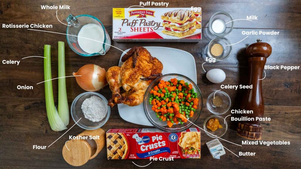 🥣 Key Ingredients: Chicken, butter, milk, frozen vegetables, pie crust