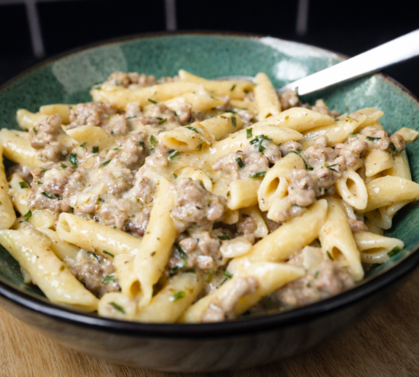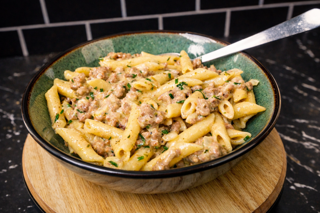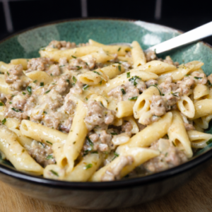 🥣 Key Ingredients: Penne Pasta, Ground Beef, Heavy Cream, Parmesan Cheese, Garlic