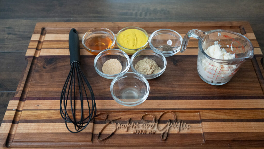 - In a medium-sized mixing bowl, add the mayonnaise, Dijon mustard, yellow mustard, garlic powder, and apple cider vinegar. Next, pour in the honey.