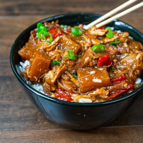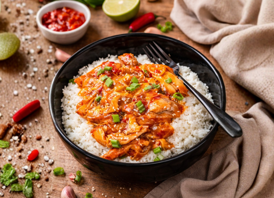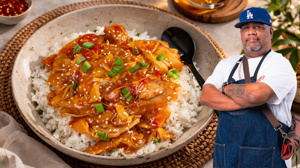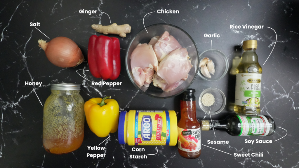 🥣 Key Ingredients: Chicken thighs or breasts, sweet chili sauce, soy sauce, bell peppers, garlic and ginger