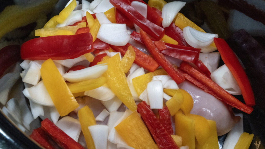 - Slice the red bell pepper, yellow bell pepper, and onion into even strips. Layer the vegetables right over the chicken in the slow cooker so they soften as they cook and add flavor to the sauce.