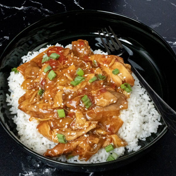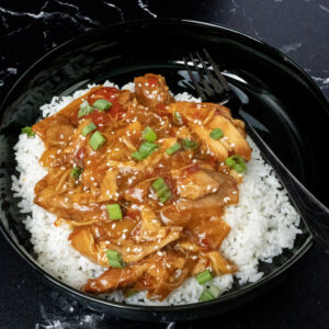 In a small bowl, mix the cornstarch and water to make a slurry. Stir it into the slow cooker during the last 30 minutes of cooking on high to thicken the sauce. Once the sauce is glossy and slightly thickened, serve the chicken over cooked rice and garnish with chopped green onions and sesame seeds.