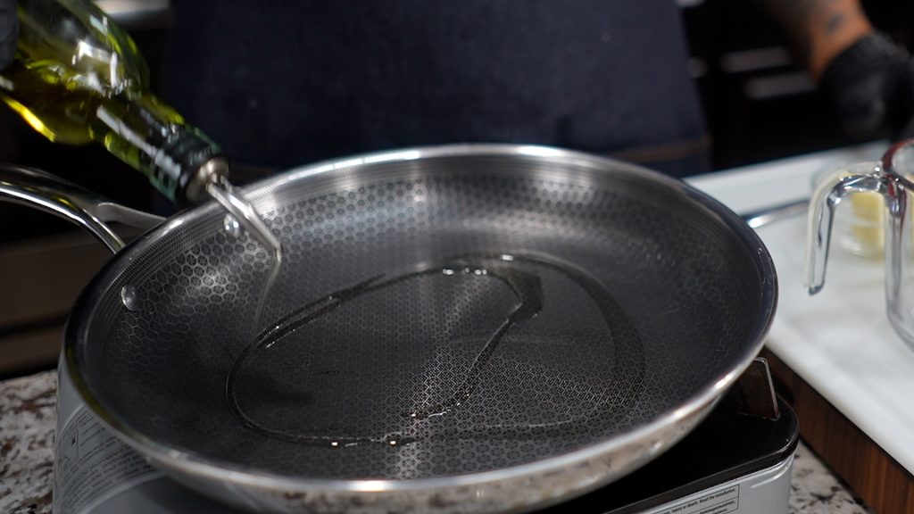 • In an oven-safe pan, heat up that infused olive oil over a medium flame.