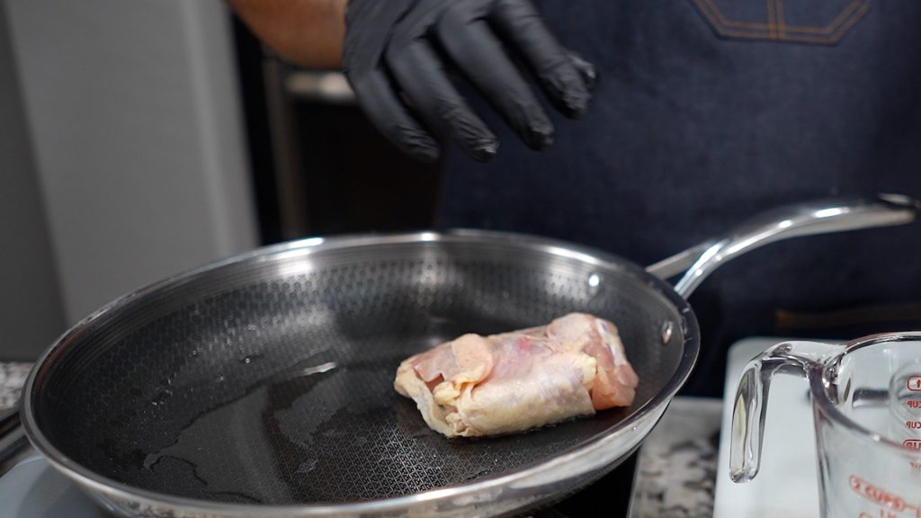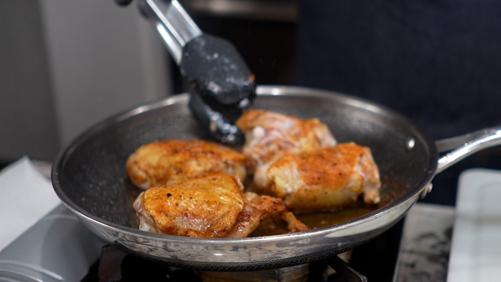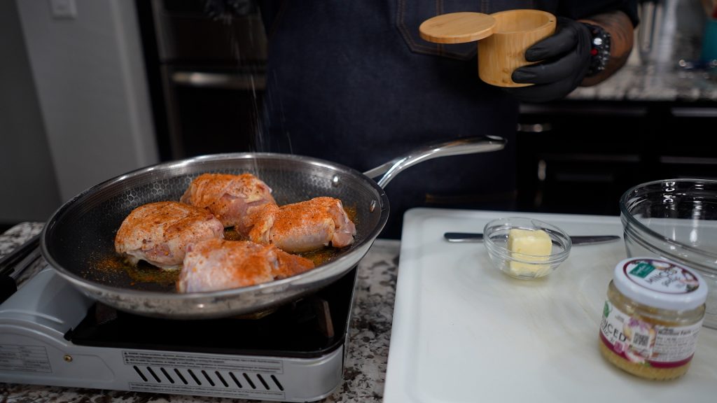 • Preheat the oven to 365°F. In an oven-safe pan, heat infused olive oil over medium flame. Place the chicken pieces skin side down and sprinkle with your chosen seasoning. Add a pinch of salt. Brown the chicken on both sides until it releases easily from the pan. Adjust seasoning as needed.