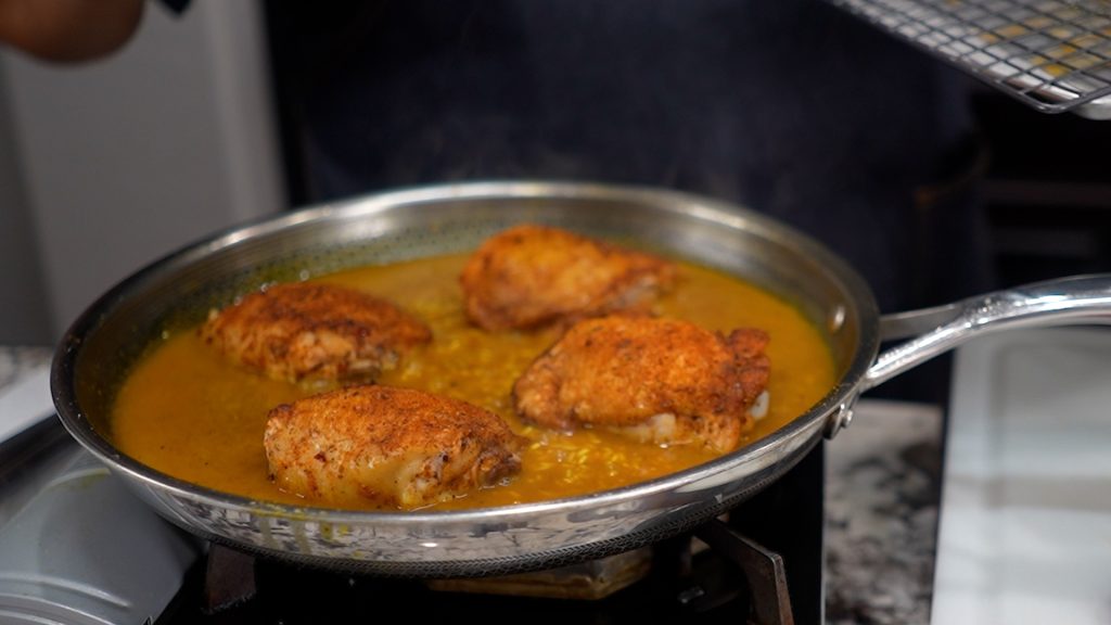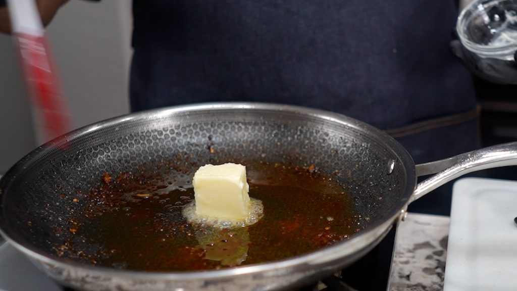 • Remove any excess chicken grease, leaving just enough for flavor. Now, add the butter to the pan and let it melt into golden goodness.