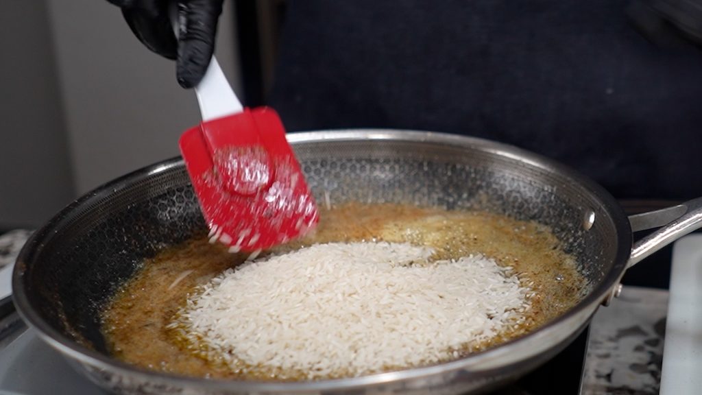 • Stir in the long grain rice and let it toast in the butter until it becomes the canvas for your culinary masterpiece.