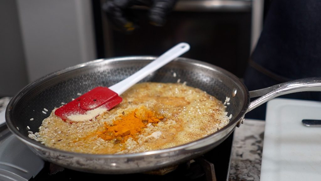 • Remove excess chicken grease, leaving a small amount. Add butter to the pan and melt it. Stir in 1 cup of long grain rice and toast it in the butter until it absorbs the flavors. Add turmeric, garlic powder, and onion powder to the rice. Mix well to evenly distribute the spices.