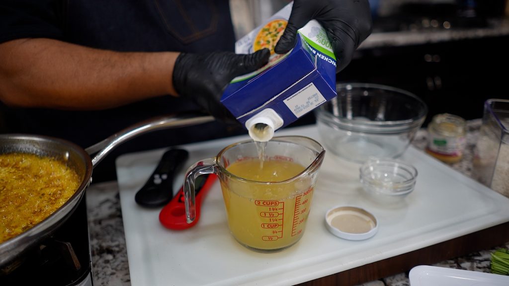 • Pour in the chicken broth or stock, bringing it to a simmer. Season with salt and black pepper to your taste preferences.