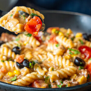 You can prepare the Enchilada Pasta up to 24 hours in advance. Simply follow the recipe up to the point before adding the cheese. Let it cool, then cover and refrigerate. When you’re ready to serve, reheat on the stovetop, add the cheese, and finish with your favorite toppings.