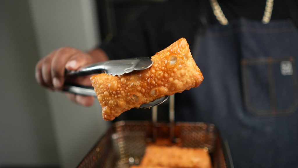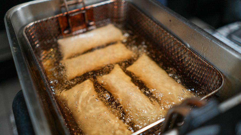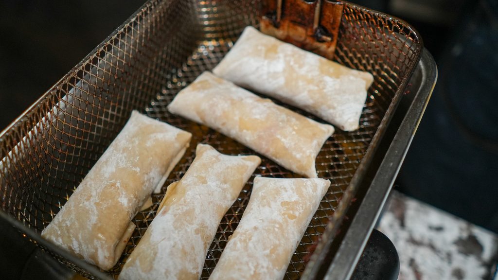 Seal and Fry: Continue rolling until only the final corner remains. Use the egg wash to brush over this corner. Complete the roll, ensuring it’s tightly sealed to prevent unraveling while frying.
