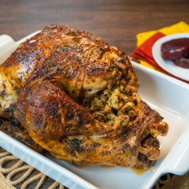 A juicy, golden-browned stuffed turkey filled with savory cornbread, veggies, and sausage delivers the perfect centerpiece for any holiday meal.