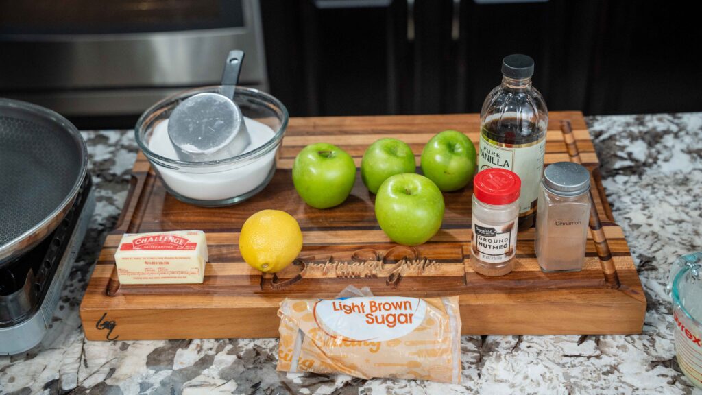 - Add apples, sugar, brown sugar, cinnamon, nutmeg, and lemon juice.