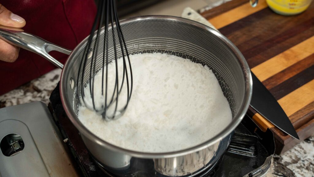- Slowly pour in heavy cream while stirring—be careful, it will bubble.