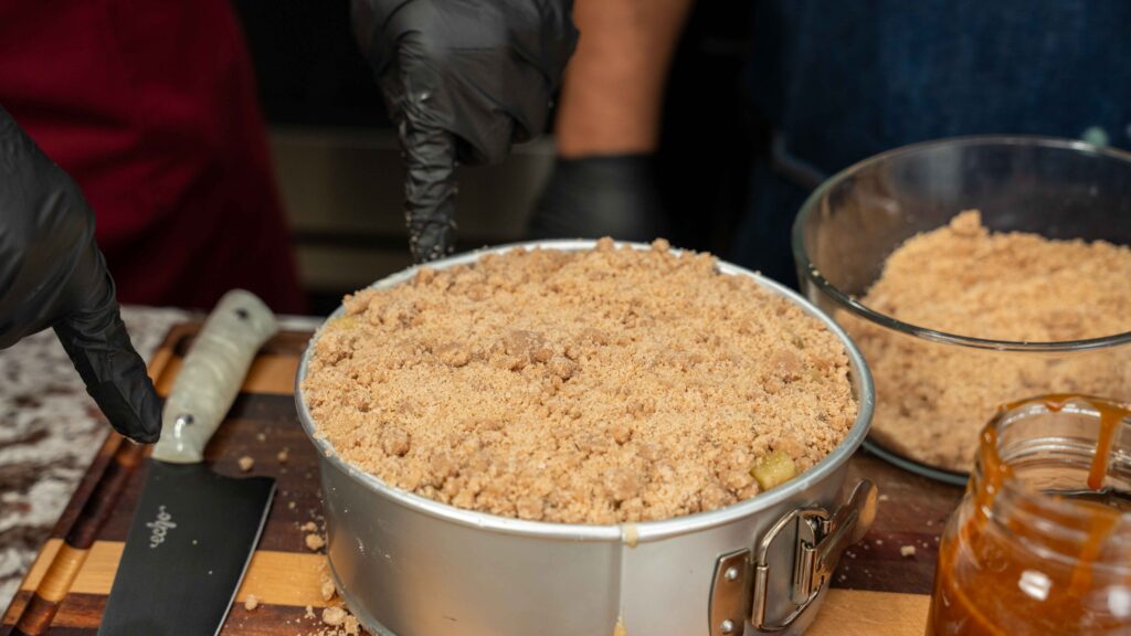 - Next, prepare the crumb topping by melting the butter and stirring in the brown sugar, flour, and cinnamon. Mix by hand until crumbly, like the topping on a coffee cake. To make the caramel sauce, heat the sugar in a saucepan over medium heat, whisking constantly until it melts and turns a deep amber color. Add the butter, stir until incorporated, then slowly pour in the heavy cream while whisking. Simmer for a minute or two until the sauce thickens, then let it cool slightly.