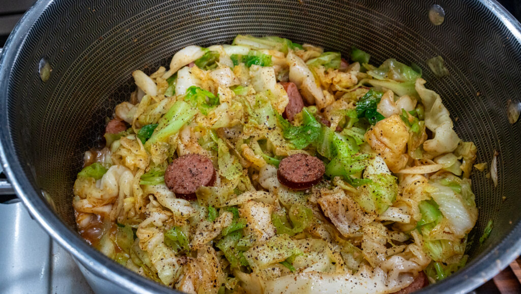 Add the chopped cabbage to the skillet and season with Creole Kick, salt, and black pepper. Stir to coat in the fat, then reduce heat to medium-low, cover, and cook for 10–15 minutes, stirring occasionally, until the cabbage is tender. Add a splash of water or broth if needed. Return smoked sausage to the skillet.