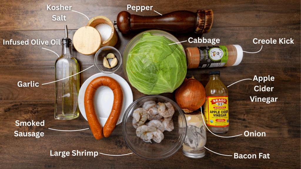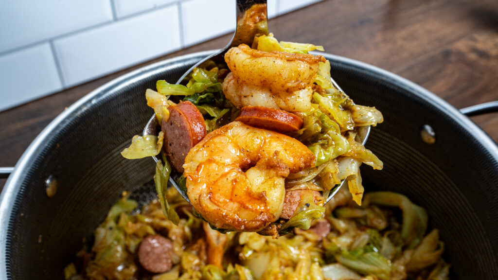 🥣 Key Ingredients: Green cabbage, smoked sausage, shrimp, bacon fat