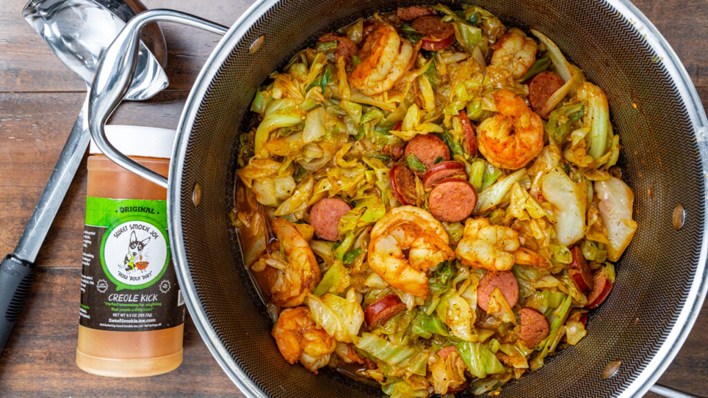- Add the chopped cabbage to the skillet and season with additional Creole Kick, salt, and black pepper. Stir to coat, cover, and cook until tender, stirring occasionally.