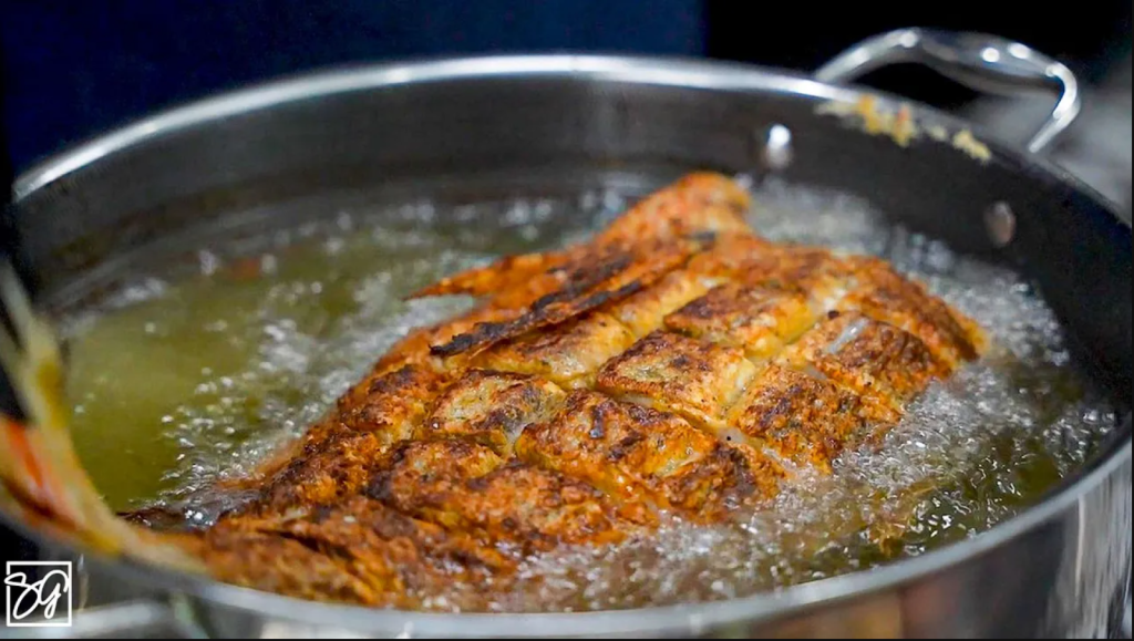 - Carefully place the seasoned red snapper into the hot oil.