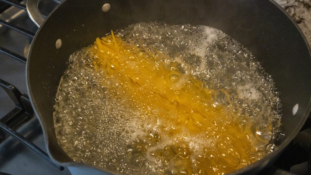 - In a large pot, bring 4-6 cups of water to a rolling boil. Add a pinch of salt to the water to enhance the noodles’ flavor. Once the water is boiling, add 8 ounces of spaghetti noodles. Cook the noodles for 9-11 minutes, or just until they’re al dente. You want them to have a little bite to them, not too soft. Drain the noodles and set them aside while you prepare the sauce.