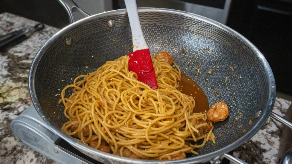 - Once the noodles are well-coated in the sauce, remove the skillet from the heat.