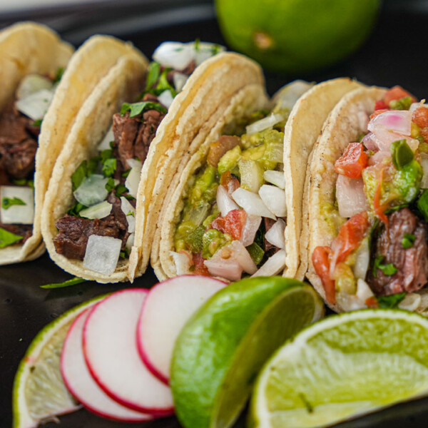 Place a generous amount of grilled carne asada on each tortilla. Garnish with fresh cilantro, diced onion, and a squeeze of lime juice. Top with a dollop of guacamole and thinly sliced radishes for an extra crunch.