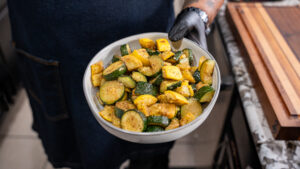 - Now, let’s prepare the roux. Heat one cup of vegetable oil, add one cup of all-purpose flour, and stir until you achieve a desirable nutty color. Avoid going too dark. Following this, sauté the onions for added flavor.