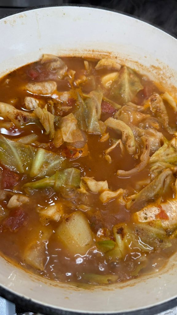 Stir in the chopped cabbage. Bring the stew back to a boil, then reduce heat again to medium-low. Cover and cook for another 5 minutes, stirring occasionally.