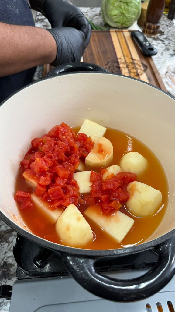 - In a large pot, combine quartered potatoes, canned tomatoes with juice, chopped onion, chicken stock, and minced garlic. Bring to a boil over high heat.