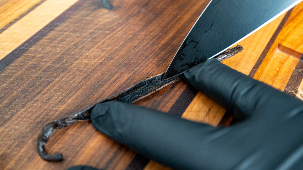 - Split each bean lengthwise with a sharp knife. Leave the seeds inside for maximum flavor.