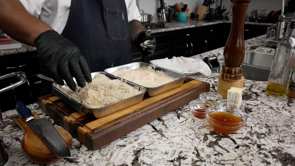 Take one piece of chicken at a time and dip it into the batter tray, making sure it’s fully coated. Let any excess batter drip off before transferring it to the panko tray. Gently press the breadcrumbs onto the chicken so they adhere well on all sides. Place each coated tender on a clean plate and repeat with the remaining pieces.