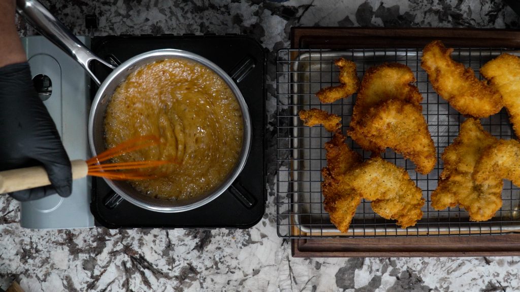 While the chicken is frying, prepare the hot honey glaze. In a small saucepan, melt the butter over medium heat. Stir in the honey, hot sauce, red pepper flakes, and apple cider vinegar. Allow the sauce to simmer for 2 to 3 minutes until slightly thickened and well blended.