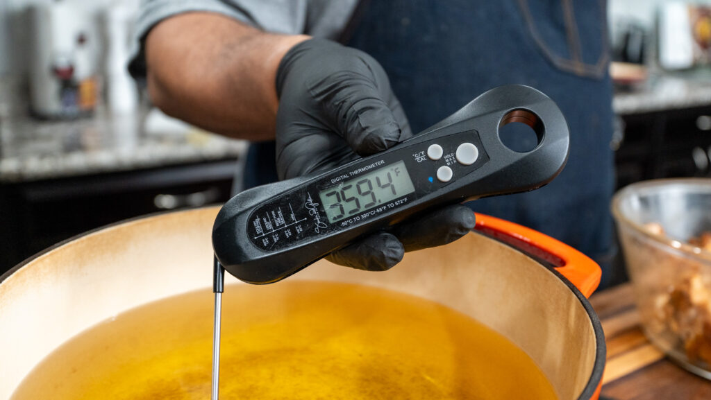 Heavy pot or deep fryer, thermometer (clip‑on or instant‑read), tongs, sheet pan fitted with a wire rack, and a medium saucepan.