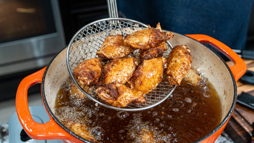 1. Fry. Working in batches, fry wings 12–15 minutes until deep golden and very crisp (internal temp should reach 165°F/74°C).