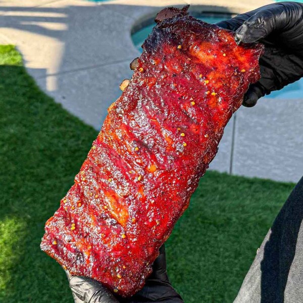 - After about 3 hours, check the color and texture of the ribs. They should have a rich, mahogany color from the rub.