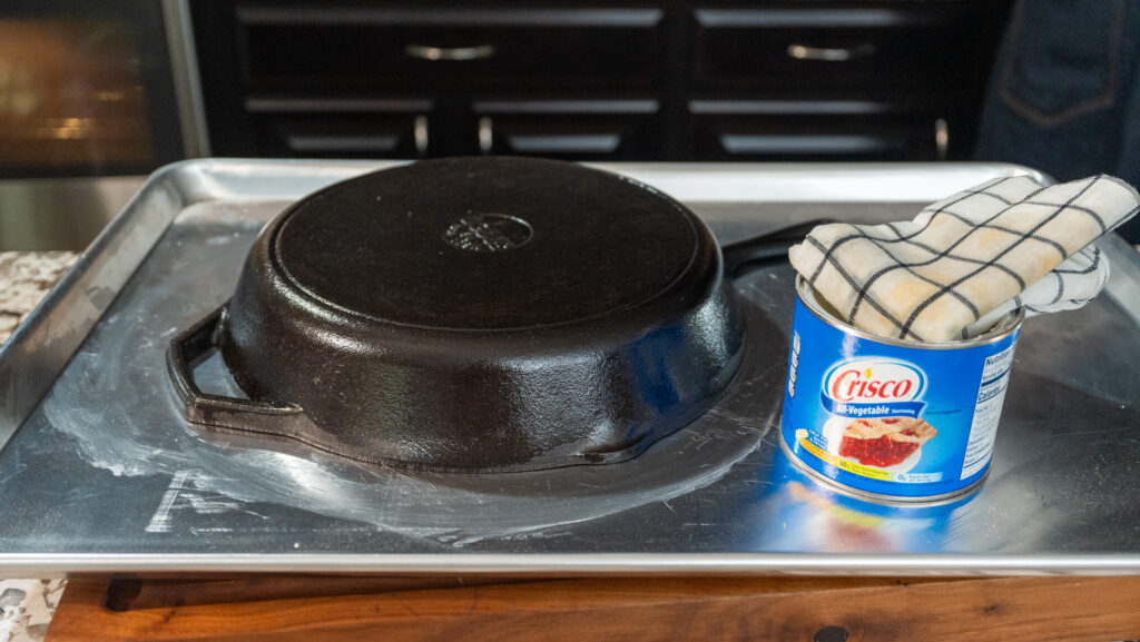Now for the star of the show—Crisco. While the skillet is warm, rub a thin layer of Crisco over the entire surface—inside, outside, handle, and bottom. Get into all the nooks and crannies. Wipe away any excess with a lint-free rag (too much oil leads to sticky spots).