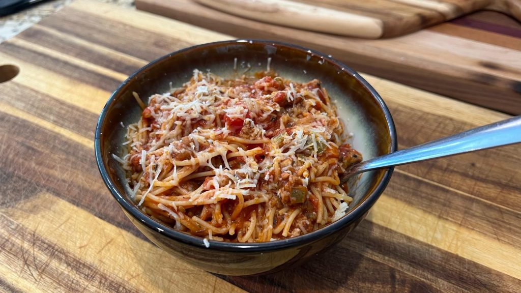 We’re takin’ your standard pasta night and giving it a glow-up. This sauce is meaty thanks to the Italian ground chicken, rich thanks to those San Marzano tomatoes, and flavorful thanks to a powerhouse blend of herbs, garlic, and a little kick of red pepper flakes. Add in some bell pepper and celery for that extra texture and depth, and you got yourself a full-bodied sauce that clings to every noodle like it was made to be there.